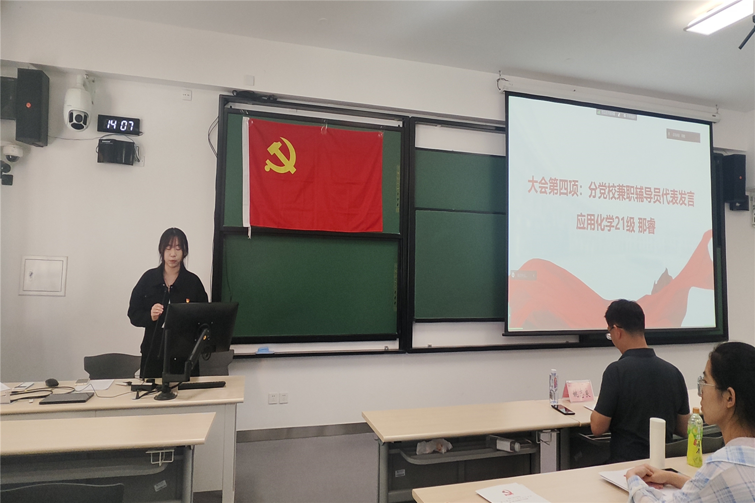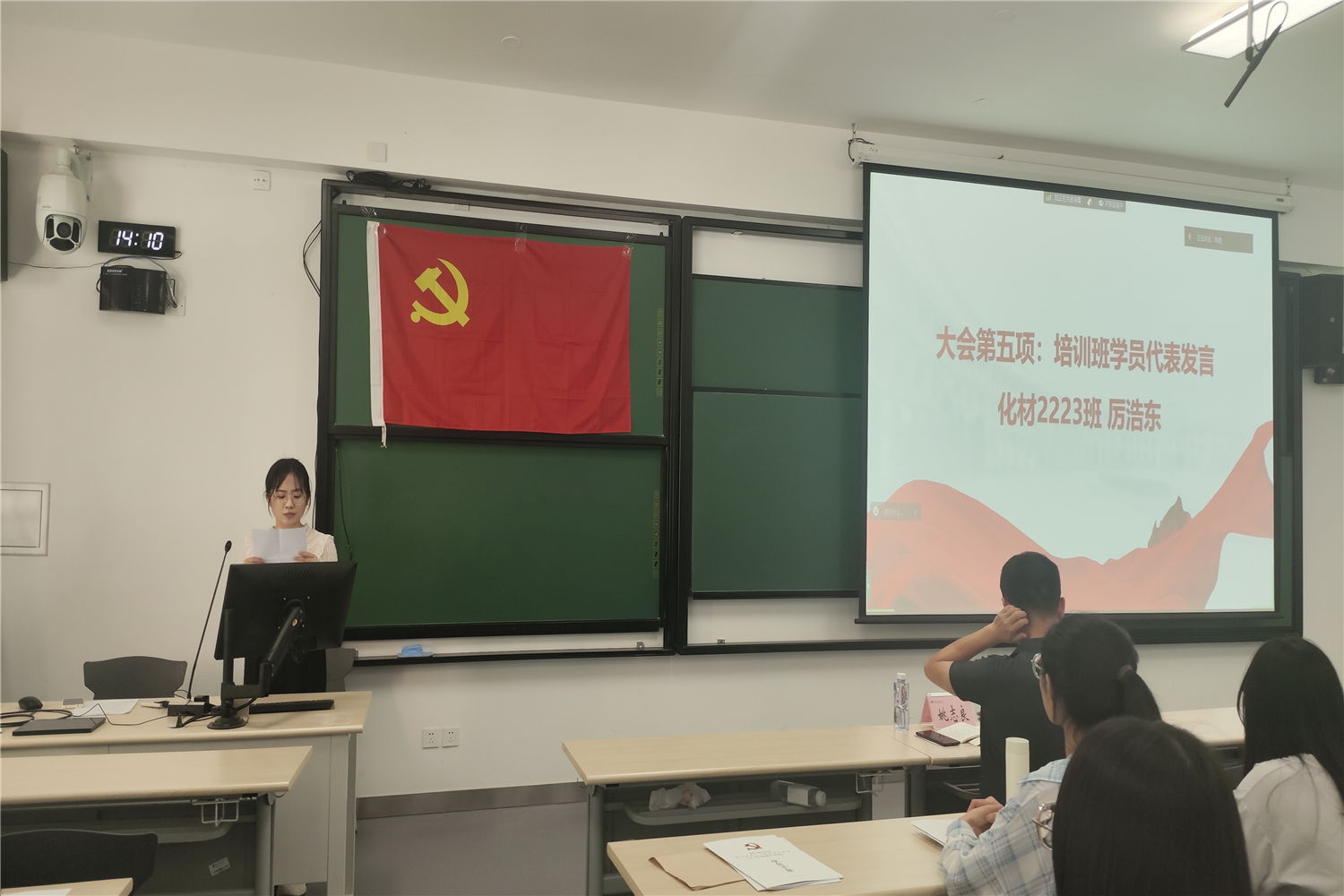 应用化学21级那睿同学作为分党校兼职辅导员代表发言,她鼓励全体学员通过培训增强政治意识和思想理论修养,端正入党动机,坚定理想信念,并介绍了本次培训内容和纪律要求。化材2223厉浩东同学代表本期培训班学员表达了对加入党组织的向往之情,希望同学们通过学习丰富自己对党的认识和理解,在政治上做表率,在学习上做标兵,在工作上做典范。