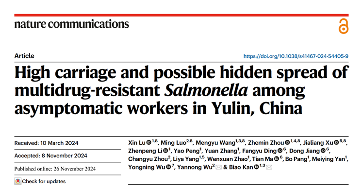 抗生素抗性基因(Antibiotics resistance genes,ARGs)是新型的环境污染物,ARGs的传播是畜牧业养殖、食品安全和公共卫生中重大问题。抗生素耐药(AR)细菌问题日益严重,对食品安全和公共卫生构成了真正的威胁。生物工程系徐嘉良副教授为共同第一作者,17级研究生杨丽雅为参与作者,与中国疾控中心,食品安全评估中心、山东大学、玉林疾控中心、苏州大学等单位合作,在Nature communications 发表“High carriage and possible hidden spread of multidrug-resistant Salmonella among asymptomatic workers in Yulin, China”的文章。