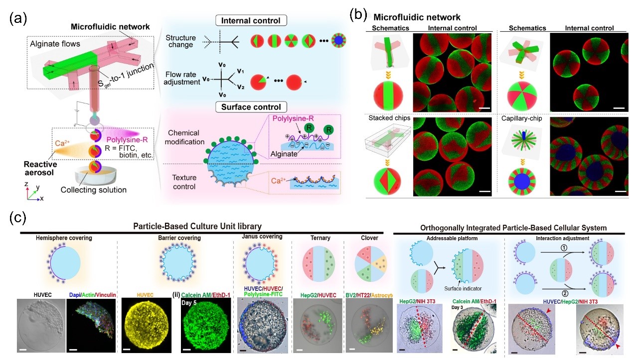 研究通过微流体网络调整内部区室的数量和几何形状,并利用反应气溶胶进行复杂的表面工程,包括化学和表面修饰,从而实现对水凝微粒内部和表面功能的正交控制。研究团队在各种水凝胶材料上的实验展示了OAMF的可扩展性,能够生成具有复杂内部结构和独特表面设计的微粒。这种正交控制能够创新性地构建多细胞系统,实现精确的细胞布局和定制细胞间相互作用,标志着“器官微粒”技术的进步。该方法为设计工程微粒提供了一种通用策略,可为组织工程、药物筛选和生物医学应用等领域带来革命性的变化。