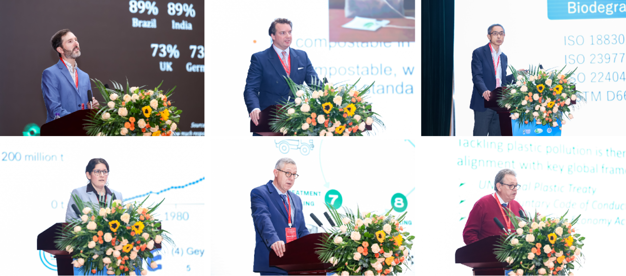 大会主旨报告由中国工程院院士孙宝国主持,中国工程院院士王玉忠、张立群分别作主旨报告。数十位国内外专家和行业组织代表作主题报告,围绕技术创新、产业化进程和政策趋势进行了深入探讨。美国生物分解塑料研究会(BPI)、韩国生物塑料协会(KBPA)、日本生物塑料协会(JBPA)、欧洲生物塑料协会(EUBP)、国际农用塑料协会(CIPA)、欧洲农业非包装塑料管理专业组织(APE Europe)等国际组织代表分享了国外生物塑料政策、标识体系及生物降解塑料推广应用等方面的最新动态。