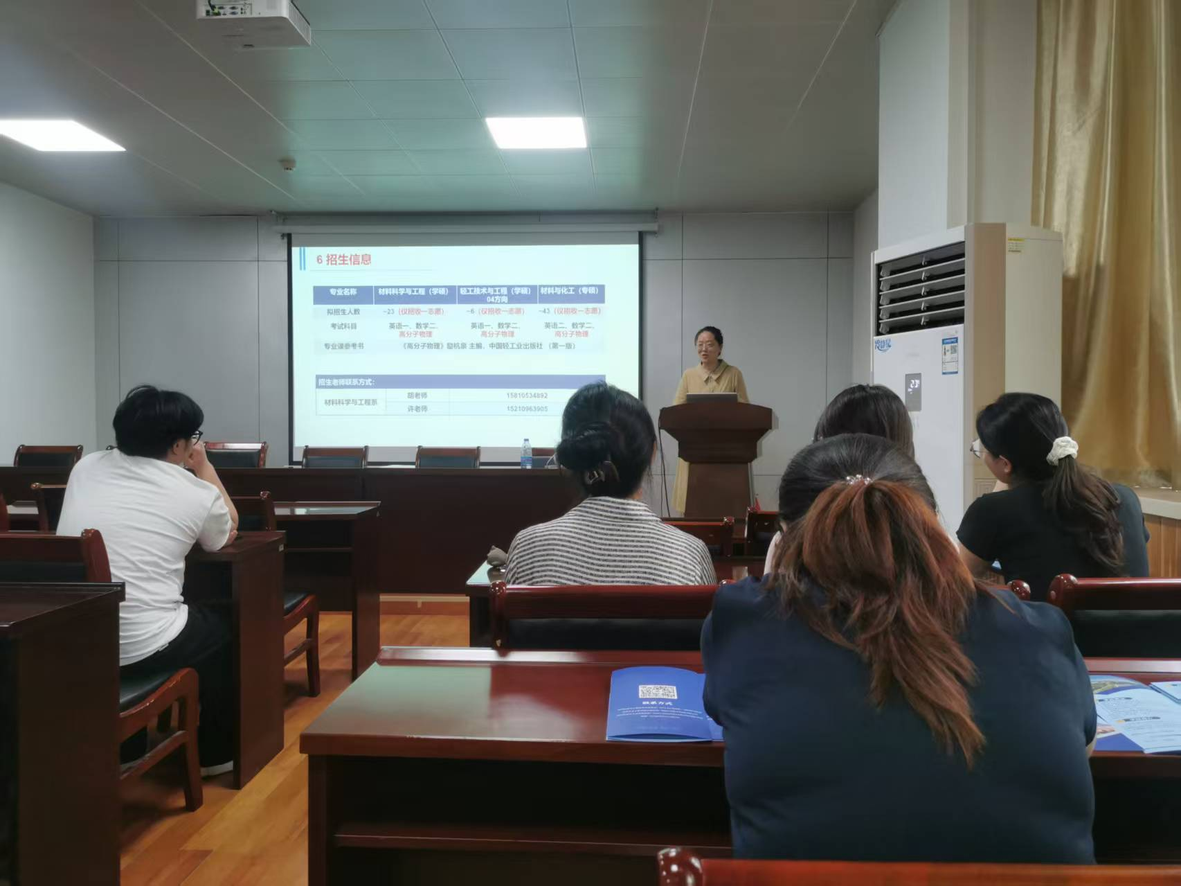 宣讲老师就学科发展历程、学科科研优势、区位优势,生物降解材料、阻燃材料、轻量化材料三个特色方向的科研成果、招生信息等情况进行了宣讲。